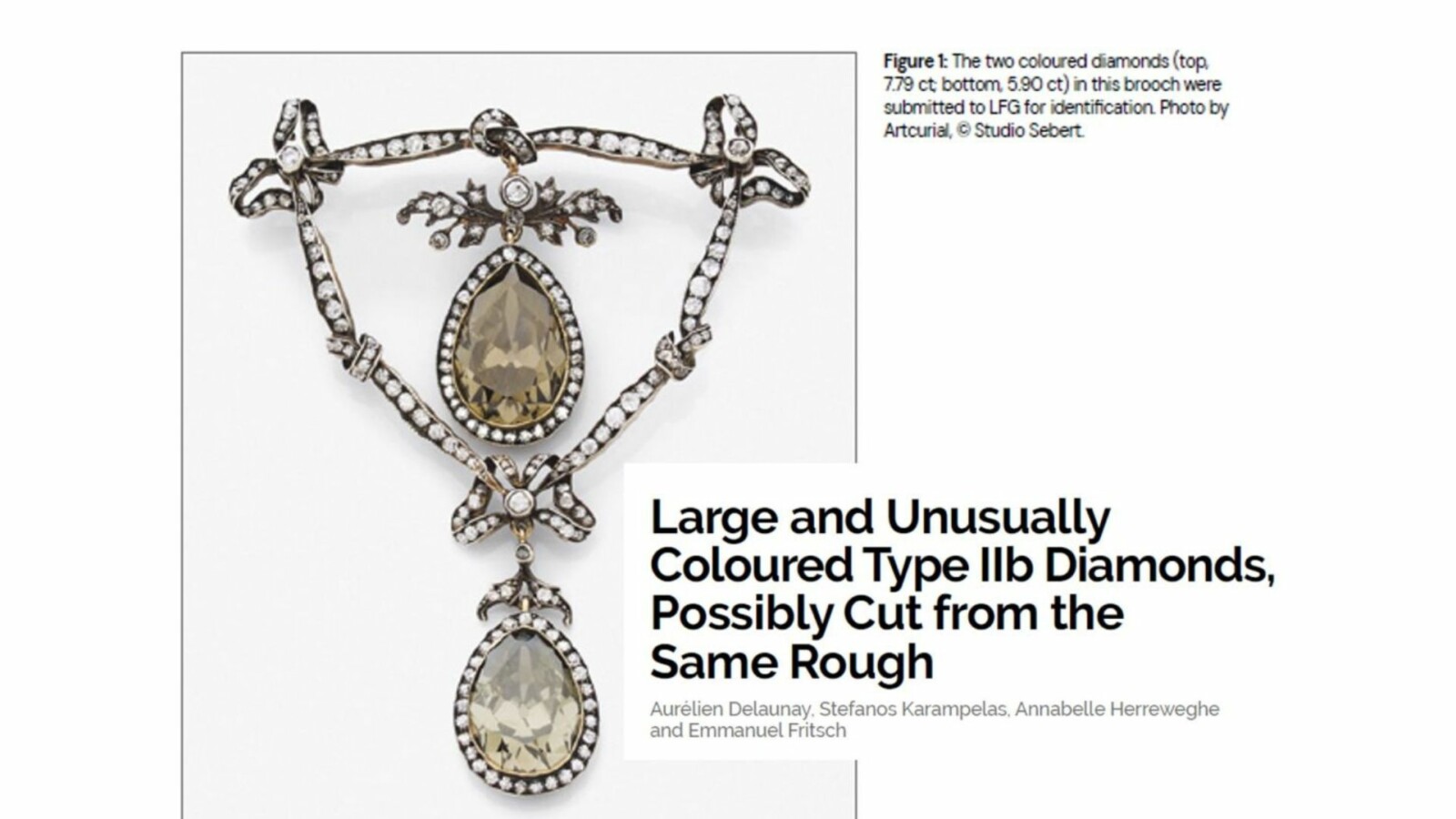 The 2 large pear-shaped old-cut diamonds (7.79 ct and 5.90 ct) colours were difficult to describe, a mixture of grey, green and brown. When the scientific analyses highlighted the rare type of these diamonds, our gemmologists were very intrigued.