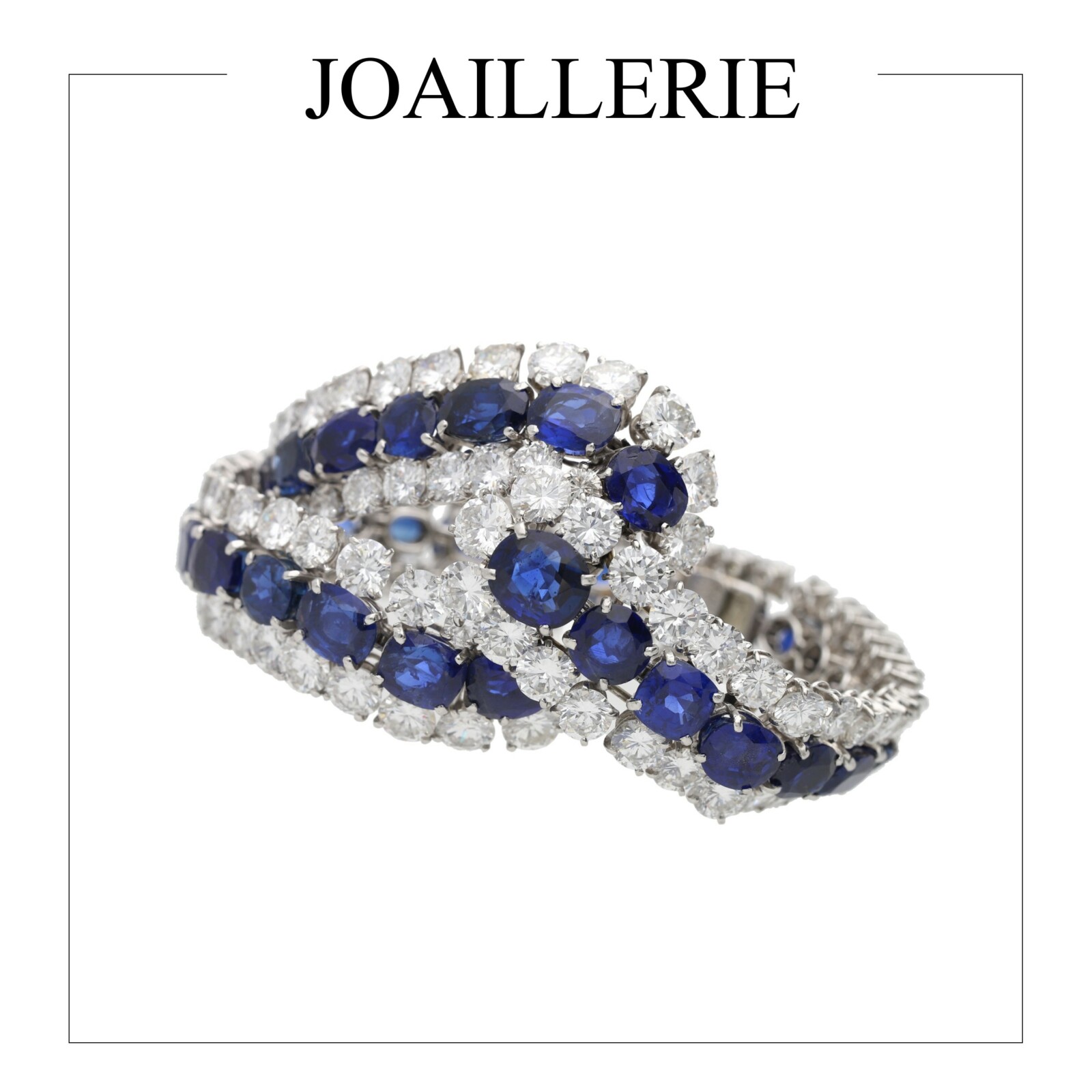 Forming a stylized buckle set with a row of faceted sapphires and framed by brilliant-cut diamonds, the bracelet is made of platinum and 18k gold.