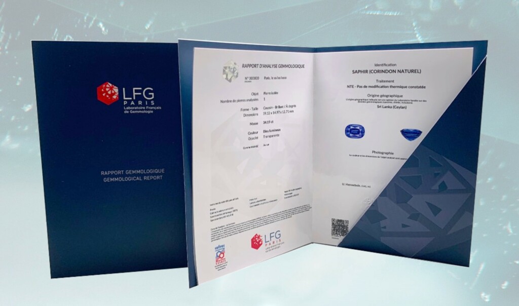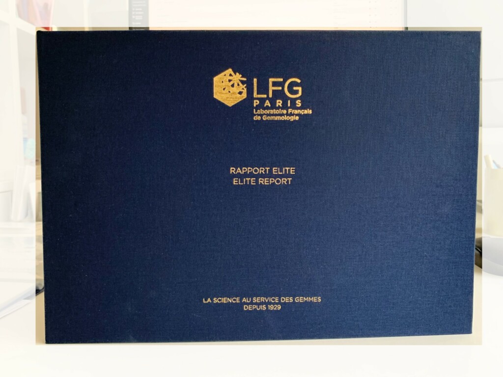 The prestigious, tailor-made analysis report, highlighting the exceptional stones and jewels - A4 landscape format triptych folder.