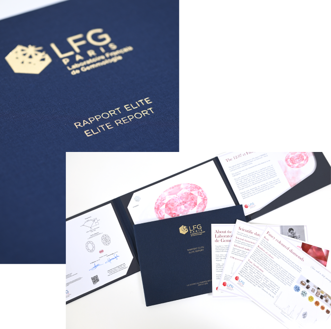 Le rapport d'analyse prestigieux et sur-mesure, mettant en valeur les pierres et bijoux d'exception - Dossier triptyque format paysage A4.