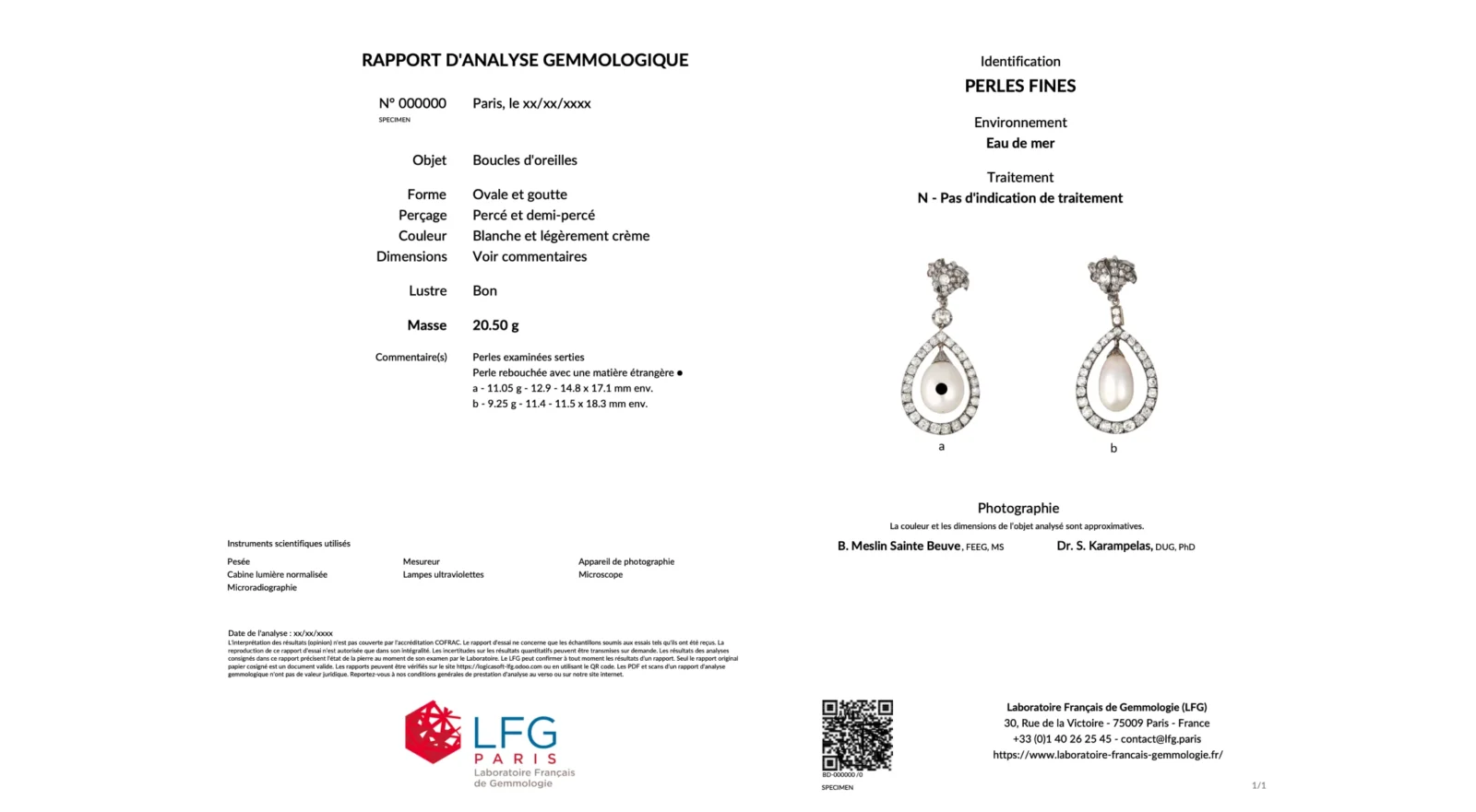 Dans le cas d’un objet avec plusieurs perles ou d’un lot, le LFG précisera le nombre de perles de cultures et le nombre de perles fines analysées.