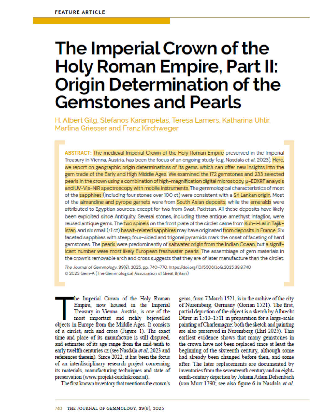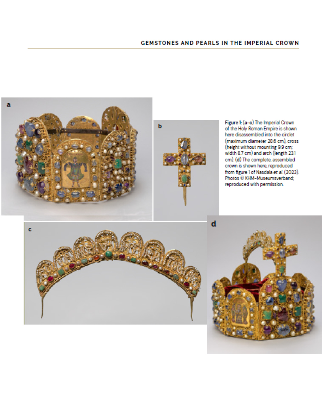 Pour découvrir les autres identifications et origines géographiques des gemmes de la couronne du Saint-Empire, nous vous invitons à lire l’article « The Imperial Crown of the Holy Roman Empire, Part II: Origin Determination of the Gemstones and Pearls », paru dans The Journal of Gemmology, volume 39 /N°8 /2025.